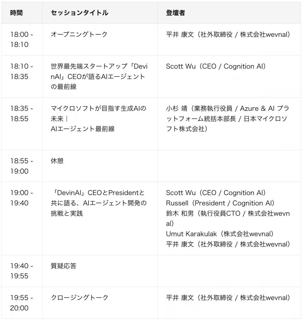 本イベントでは、世界が注目するスタートアップ「DevinAI」を運営する「Cognition AI」のCEO・Presidentに加え、日本マイクロソフト社 業務執行役員 / Azure & AI プラットフォーム統括本部長、wevnalの執行役員CTOが登壇。AIエージェント開発の“今”と“未来”を多角的に語ります。
